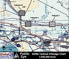 Tactical Pilotage Chart with NIMA CIB imageryoverlayed showing the three Fallujah CW plants in relation to the towns of Fallujah, and Al Habbaniyah  |