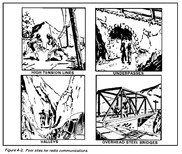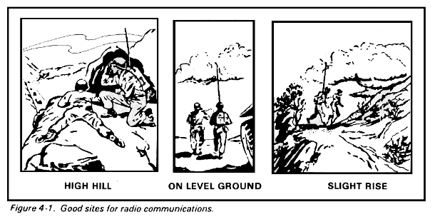 Hills and mountains between stations normally limit the range of radio sets. In mountainous or hilly terrain, select positions relatively high on the slopes (fig 4-1). Avoid a location at the base of a cliff or in a deep ravine or valley (fig 4-2). For operation at frequencies above 30 MHz, and whenever possible, select a location that will allow line-of-sight communications. Try to avoid locations which provide the enemy with a jamming capability, visual sighting, or easy interception.