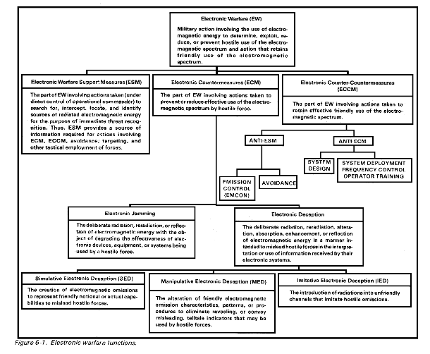 Simply stated, EW is the military action involving the use of electromagnetic energy (radio frequency waves) to determine, exploit, reduce prevent hostile use of the electromagnetic spectrum (frequency bands) and actions which retain friendly use of the spectrum. EW includes three kinds of activities. The first, electronic warfare support measures (ESM), involves actions taken to search for, intercept, locate, record, and analyze radiated electromagnetic energy for the purpose of exploiting such radiation in support of military operations. Thus, ESM provides a source of information required to conduct the second EW action, electronic countermeasures (ECM). ECM involves actions taken to prevent or reduce effective use of the electromagnetic spectrum by the opposing force. The third part of EW, electronic counter-countermeasures (ECCM), involves actions taken to ensure effective use of the electromagnetic spectrum despite EW activity by the enemy. Figure 6-1 illustrates the relationships of ESM, ECM, and ECCM.