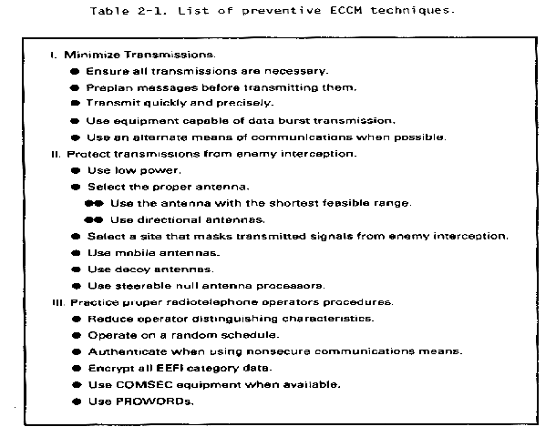 b. Reducing the vulnerability of our communications to enemy efforts to disrupt or destroy them is largely a matter of avoiding detection by the enemy. If the enemy cannot detect our communications, he will have difficulty disrupting or destroying them. Effective jamming depends on knowing the frequencies and approximate locations of units to be jammed. We must do all we can to prevent disclosing this information. Using the techniques in this chapter will help accomplish this. Table 2-1 lists preventive ECCM techniques.