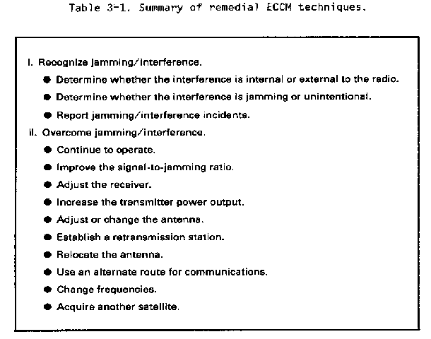 Remedial ECCM techniques (Table 3-1) reduce the effectiveness of enemy efforts to jam our radio nets. They apply only to enemy jamming efforts or any unidentified or unintentional interference that disrupts our ability to communicate. There are no remedial ECCM techniques that apply to other actions the enemy might use to disrupt or destroy our communications. We must prevent enemy jamming and interference--after the enemy has gathered information about us, we cannot get it back.