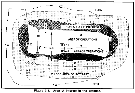 In essence, a limit of responsibility is a "no further than" line; it tells the unit, "your R&S responsibility stops here." Figure 2-15 is an example of limits of responsibility for battalions, brigades, and divisions. They may be tied to a unit's AI or may depend entirely on mission, enemy, terrain, time, and troops available (METT-T).