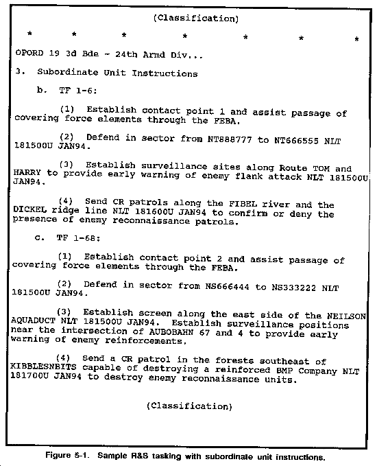 Figure 5-1 shows a sample R&S tasking with subordinate unit instructions. Maneuver battalions can also use this method when it is tailored to their level.