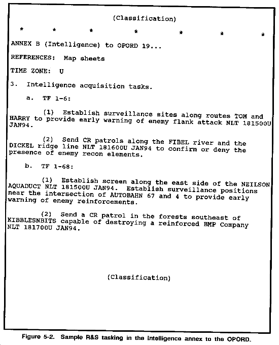 Figure 5-2 is a sample R&S tasking. Maneuver battalions can also use this method, but would tailor it to their level.