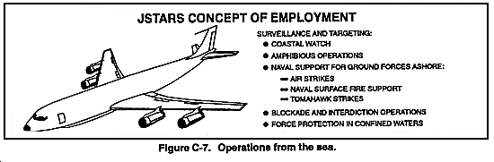 Joint STARS could also support US Forces conducting operations from the sea, as shown in Figure C-7. Here the Joint STARS aircraft is deployed and the AOC and BCE have established an operational element on board a naval aircraft carrier off the coast of a hostile country.
