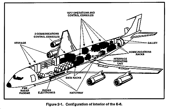 In addition to communications antennas, the E-8 aircraft has two SCDL antennas. One SCDL antenna is mounted on the top, and one is mounted on the bottom of the E-8 aircraft to provide a continual datalink to the GSM, even when the E-8 turns during flight. Figure 2-1 shows the configuration of the interior of the E-8.