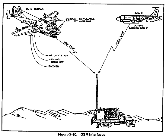 Capabilities. The IGSM receives NRT data to include MTI and SAR from the E-8 platform and MTI from the Mohawk UPD-7 platform. Figure 2-10 is an example of IGSM interfaces. The IGSM is able to receive Joint STARS MTI imagery.