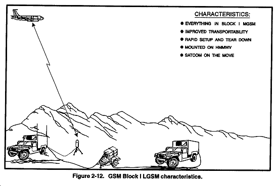 The Block I LGSM has virtually the same capabilities as the Block I MGSM except that it is transported by a different prime mover and has SATCOM receive on-the-move capability. Also because of the inherent flexibility built into the LGSM, it is easy to achieve technological upgrades and accomplish vehicle reconfiguration to support operations. For example, the vehicles can move with the Tactical Operations Center (TOC), receive SCDL data on the move, and setup quickly to support the commander. Figure 2-12 shows LGSM characteristics.