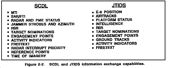The SCDL also allows for reprocessed radar data which includes tracked versus unknown indications, target locations, E-8 location and speed, and information time tags. The SCDL carries the RSR and freetext messages from the GSM to the operators on the E-8. Figure 2-2 shows the SCDL and JTIDS information exchange capabilities.