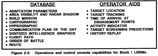 Operation and Control Console Capabilities. The O&C console subsystem allows the mission crew to access the radar data in real-time on their consoles. These are basically the same capabilities that exist in the GSMs as shown in Figure 2-3. The workstations allow operators to tailor the radar products to their needs. They can access databases to provide amplifying information on friendly and enemy order of battle (OB), receive and send freetext messages over SCDL, and conduct crew coordination. The operators can perform history playback, construct SAR mosaics, track targets, and perform target position predictions. There is also a printer capability to provide prints of time-designated screen displays with complete annotations.