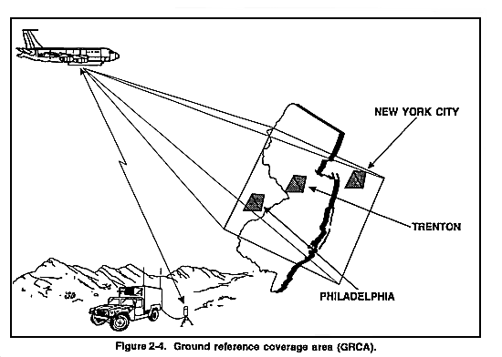Radar Capabilities. The E-8 radar is capable of looking deep into hostile and potentially hostile areas to detect, locate, classify, and track a variety of targets. It can be operated in two basic radar modes: MTI and SAR. The primary MTI mode is called wide area surveillance (WAS). WAS is the prime mode in radar which covers beyond a notional corps area called the ground reference coverage area (GRCA). Figure 2-4 shows an example of GRCA.