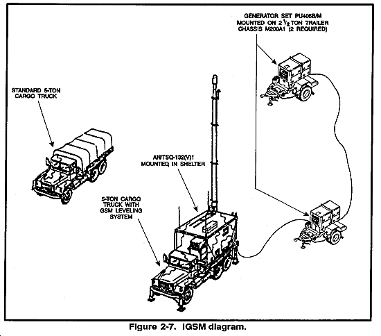 Exterior. The IGSM system is comprised in part by two 30 kW 50 to 60 Hz generator power units which connect to the IGSM shelter via a control monitor and a 100-foot power cable on all IGSMs. These generators are towed by two M-923 series 5-ton cargo trucks. One five-ton truck is unmodified and is used as a support truck to carry spare equipment and other mission-essential items. The other 5-ton truck is modified with a mechanical leveling system and is used to carry the IGSM shelter. The IGSM shelter is an S-679 which has intake and exhaust vents, an environmental control unit, and a retractable 100-foot pneumatic mast and cable reel system as modifications. Atop the mast is the SCDL and a UHF antenna.