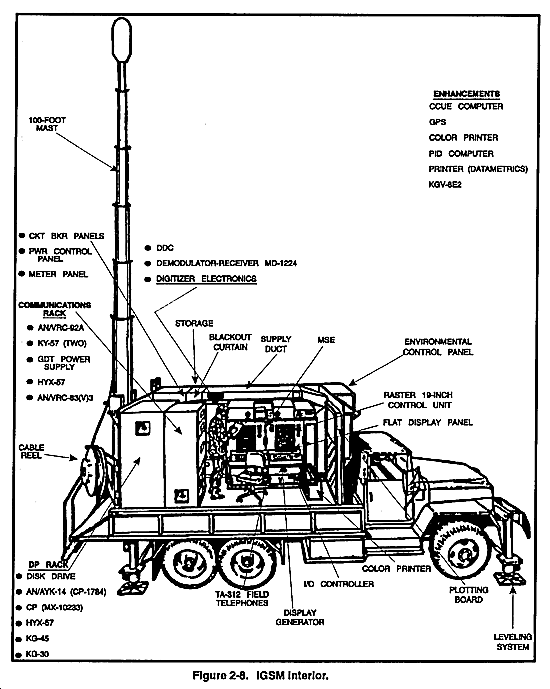- Has a secure voice and datalink with the Tactical Fire Direction System (TACFIRE). Immediate taskings can be sent via secure voice or wire via TACFIRE channels, and the results of the taskings can also be sent via this link. The operators also have a color printer in the IGSM that can print designated screen displays with annotations upon request. The operators can also display a listing of all messages in the database for reference.