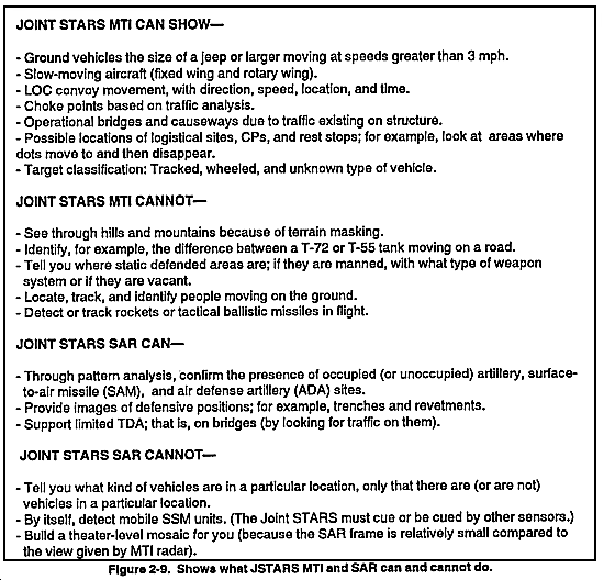 The AYK-14 computer controls the system. An AN/VRC-83 UHF radio provides voice communications with the E-8 aircraft. Two TA-312/PT telephones, now in all IGSMs, provide voice communications. The third TA-312 has been replaced by mobile subscriber equipment (MSE), KY-68, which is used for landline secure voice communications. SINCGARS (AN/VRC-92) radios are used to transmit TACFIRE data. Hard copies of messages are printed on a line printer, and a three-color screen printer produces a color hard copy of the forward screen. Figure 2-9 shows at a glance what the Joint STARS MTI and SAR can and cannot do for the commander.