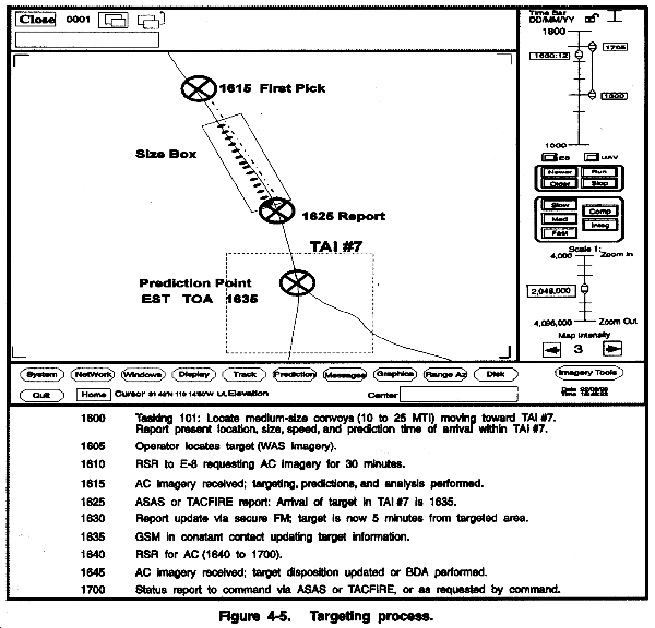 The main support to division and corps artillery is in the form of targeting. Joint STARS can locate, track, identify wheeled and tracked vehicles, and predict arrival times and coordinates of moving targets. The system can bracket areas and give the commander a count of fixed targets within that area. This targeting information can be autofilled in preformatted TACFIRE or ASAS messages and can be sent electronically, hardwire, or digital FM to the commander. Figure 4-5 is an example of Joint STARS support to the targeting process.