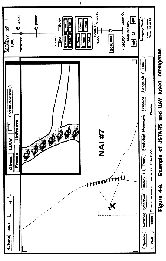 No other intelligence collection systems complement one another more than Joint STARS and UAV. Each system's strength supports the other's weakness. UAV's ability is extremely limited when used for general search and detection over unfamiliar terrain. UAV is effective when used to observe point targets or conduct route reconnaissance. Joint STARS with area coverage can locate targets to direct UAV to investigate. This gives the command increased ability to analyze the battlefield. By combining both, the command can receive a single product--fused imagery and information. Figure 4-6 shows Joint STARS imagery and UAV imagery fused into a single product.