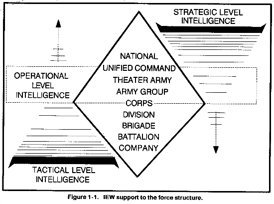 Figure 1-1 shows how the Army IEW system focuses support on the Army's operational force structures. The diminishing length of the lines indicates the relative value of the intelligence to the different levels of the structure of warfare. The figure shows that the greatest amount of both tactical and strategic intelligence occurs at the operational level. It is here that the integration process has the most influence on military strategy.