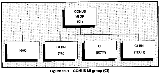 The CONUS MI group (CI), shown at Figure 11-1, has an HHC and three CI battalions: CE, security, and technical.
