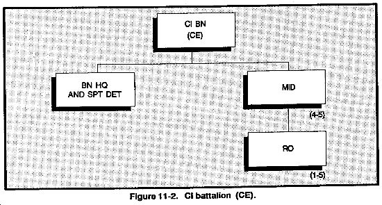 Typically the CI battalion (CE), shown at Figure 11-2, has a headquarters and support detachment, four-to-five MIDs, and one-to-five ROs for each MID.