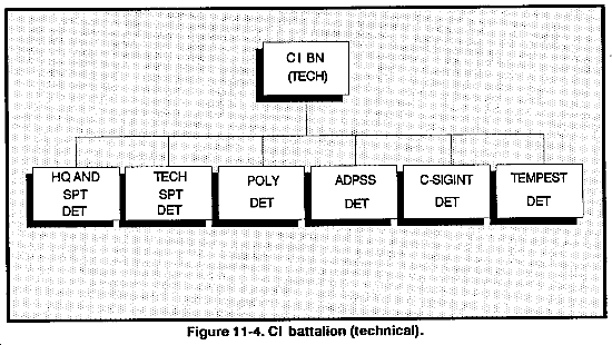 The CI battalion (technical), shown at Figure 11-4, includes a headquarters and support detachment, technical support detachment, polygraph detachment, ADPSS detachment, C-SIGINT detachment, and TEMPEST detachment.