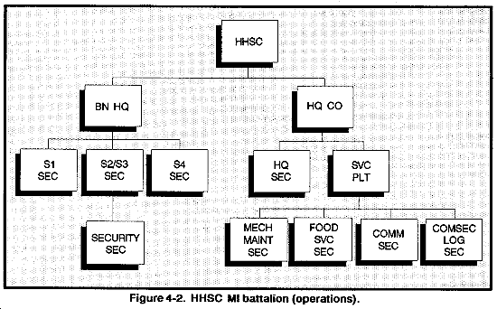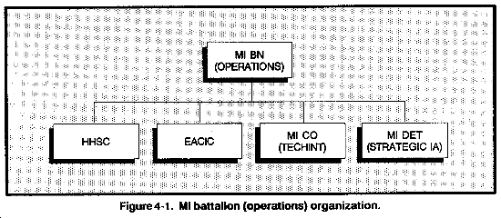 This chapter describes the mission and structure of the MI battalion (operations). In addition, it describes the structure and operations of the EACIC and other companies subordinate to the MI battalion (operations). If the MI battalion (operations) is not established within a particular theater, the EACIC and other intelligence disciplines in the units described below may continue to be separate organizations until the MI battalion becomes part of the brigade structure. Figure 4-1 shows the organization of the MI battalion (operations).