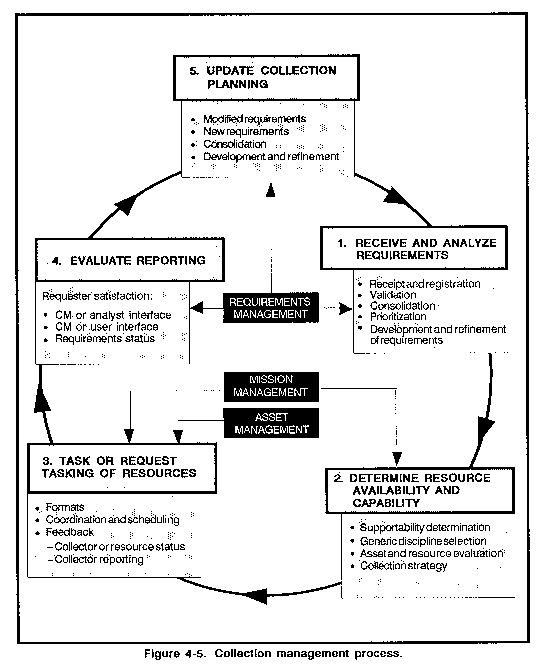 The CM&D section is responsible for requirements and mission management. Requirements management defines what to collect. Mission management defines how to satisfy the requirement. The CM&D primary function is to use all collection resources available to assist the G2 in satisfying the theater Army commander's PIR and IR. CM&D section internal procedures are guided by the CM process, as shown in Figure 4-5. This CM process further delineates the asset management responsibilities of commanders.