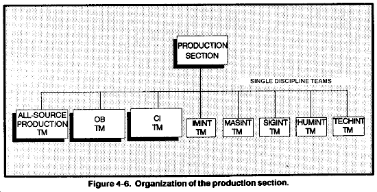 The production section produces and reports all-source intelligence to supported commands and IEW units. The production section, as shown in Figure 4-6, consists of an all-source production team, order of battle (OB) team, CI team, and five SDTs. Each SDT represents a single intelligence collection discipline.