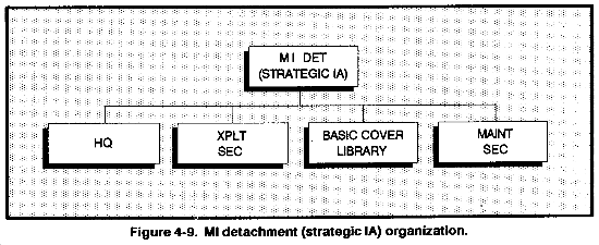 The MI detachment (strategic IA), shown at Figure 4-9, has a headquarters, exploitation section, basic cover library, and maintenance section.