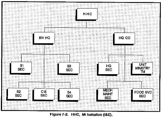 The HHC includes personnel for the battalion headquarters and the headquarters company. Figure 7-2 shows this organization.