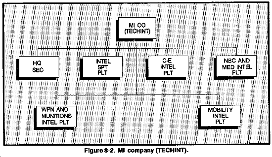 The individual platoons begin the source directed requirements process by routing questions for interrogators to use in exploiting personnel with specific and critical technical knowledge (see Chapter 6). The MI company (TECHINT) is organized as shown at Figure 8-2.