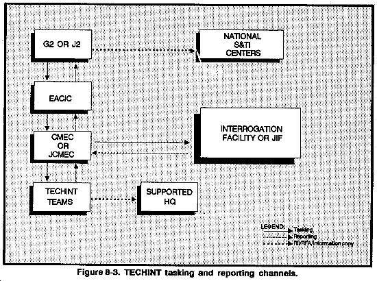 The CMEC has the same mission as the MI company (TECHINT) and is formed from personnel from the company. Figure 8-3 shows the TECHINT tasking and reporting channels that would be established within a theater. A CMEC is created only during wartime or contingency operations. Its mission includes--