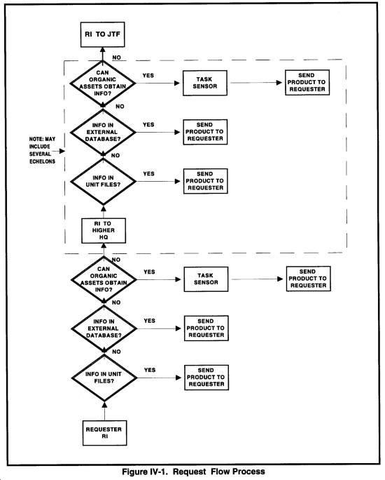 (a) If the S2/G-2 cannot satisfy reconnaissance requests with organic assets, the request will be forwarded to the next higher echelon. The process is repeated at each level until the information is located, a collection platform tasked, or the request denied for some other reason. If Army echelons cannot satisfy the request, the highest Army echelon forwards the request to the land component commander (LCC).