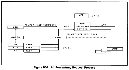 (3) Immediate Requests. When commanders require a more rapid response to changing battlefield conditions that make preplanned requests unsuitable, they may submit an immediate reconnaissance request. The unit's TACP submits immediate reconnaissance requests via Air Force channels (normally, the Air Force Air Request Net [AFARN]) to the air support operations center [ASOC]). The immediate request process works as follows: