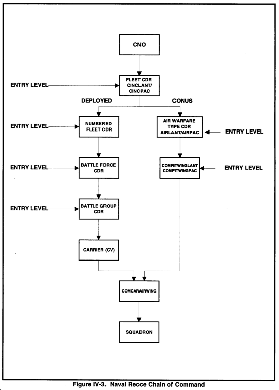 (2) Chains of Command. Figure IV-3 illustrates the chains of command for requesting reconnaissance and electronic warfare support (ES) missions. The command levels where requesters can "enter the system" to request missions are called "entry levels" and are indicated in Figure IV-3 by the arrows.