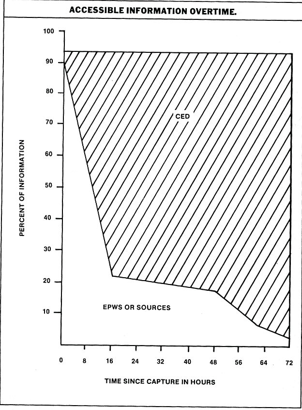CEDs, while not affected by memory loss, are often time sensitive and are screened for possible exploitation as quickly as possible. Interrogators were given the CED exploitation mission because of their linguistic ability. This makes printed and typed material readily exploitable, but many handwritten documents are illegible. Information contained in undeveloped imagery and recordings is inaccessible to most interrogation elements. The intelligence value of painted, drawn, or engraved material cannot be exploited by many elements unless it is accomplished by explanatory information in writing. An example of this would be an overlay prepared without map data, registration points, or identifying terrain features. In spite of these limitations, an estimated 90 percent of all the information contained in CEDs can be exploited. The following illustration shows a comparison along a time line of the amounts of information available to the interrogator from the two collection targets. The comparison assumes that the CEDs and the sources initially had the same amount of information, and that it was of equal intelligence value. Bear in mind that the figures used are conservative estimates, and that the time between the two target types might be even greater between 24 and 72 hours. The percentage of information available from sources drops sharply during the first 24 hours after capture. This represents the rapid loss of what sources would consider to be insignificant details. A slower drop in the percentage begins at 48 hours to represent the resurgence of established value systems. This resurgence makes it harder for interrogators to obtain what information the source still remembers.