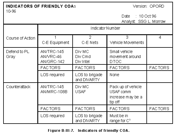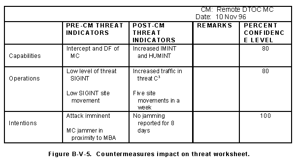 (b) Enter any changes in Figure B-V-5. Include any remarks about the implications of the changes, including whether the changes correlate with the expected result of the countermeasure. For example, you receive an intelligence report describing a decrease in threat attempts to intercept allied tactical communications because of electronic protection (EP) built into new radios. The implication is that the friendly vulnerabilities have decreased, causing a change in threat capabilities. The level ranges from 50 percent for a guess to 100 percent for certainty. Higher confidence levels are given for more specific information about an indicator, multiple sources of information, multiple disciplines, or corroboration by another analyst.