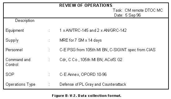 (2) Collect data about actual C-E profiles. Identify command-specific sources of data to fill the requirements. Common sources include actual participation in operations, new evaluations of equipment and procedures resulting from site survey or new equipment information, interviews of personnel, and reviews of operational reports. Begin by-