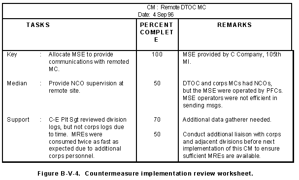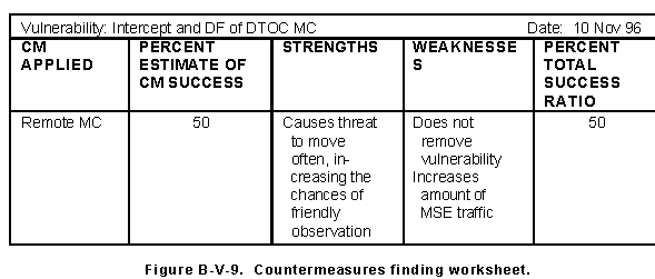 (2) Evaluate overall success of countermeasures. Using the countermeasures finding worksheet shown in Figure B-V-9, enter the estimates of success for each of the countermeasures evaluation criteria. For each countermeasure, review the level of success per objective. Count the number of cases where the countermeasure has a greater than 50 percent success rate and divide this number by the total number of cases. The resulting ratio provides an overall estimate of success, supplemented by specific success rates for particular objectives estimated in paragraph B-V-11(1).