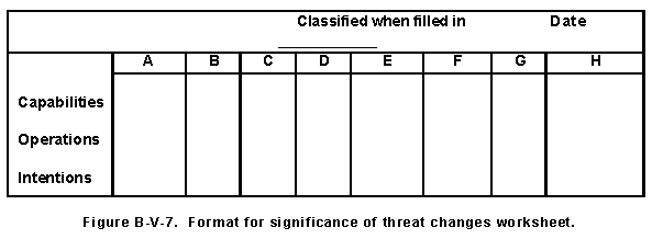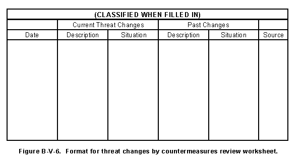 (a) Compare past examples of changes in operations, capabilities, and estimate of intentions with the current data. The comparison uses current information compiled in Figure B-V-5, past compilations, and supplementary documentation stored by the analyst. Then review the documents, collect similar threat indicators (for example, types of collectors), and list indicators for threat changes by countermeasures review worksheet shown in Figure B-V-6. Complete this form by entering descriptions of findings. In the search for changes in patterns, ask specific questions about particular threat systems and countermeasures: