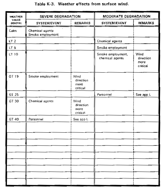 WINDS. Winds play a significant role in CB agent dispersion, chemical agent persistence, and aerial delivery methods. Very light and strong winds degrade effectiveness of smoke and NBC operations. Wind direction is considered for fallout pattern determination.