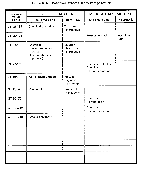 NBC operations are extremely sensitive to environmental conditions that affect the transport and diffusion of CB agents. Humidity, air temperature, ground temperature, wind direction and speed, low-level temperature gradient, precipitation, cloud cover, and sunlight are a few of the critical elements to consider when planning NBC operations. The degree of impact depends upon the synoptic situation and the local influence of topography, vegetation, and state-of-the-ground.