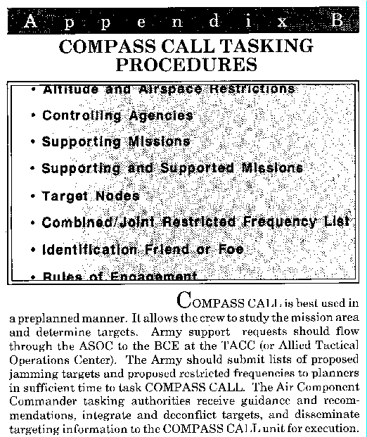 COMPASS CALL is not a tethered jammer controlled from the ground. This does not allow optimum use of the COMPASS CALL mission crew capabilities and information obtained during mission planning.
