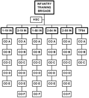 The brigade's present configuration consists of five Infantry training battalions, one reception battalion, and a headquarters and service company. Each battalion is responsible for the health and welfare of the soldier, and for that individual's instruction in basic soldier and Infantry skills.