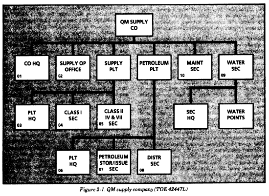 Nondivisional water support is provided on an area basis by corps and EAC Quartermaster supply companies (see Figure 2-1) operating ROWPUs. (These companies will retain their erdlators until they are replaced by 3,000-GPH ROWPUs.) The organic water supply section of the company provides water purification and storage at water supply points using approved water sources. By using the SMFT, the section can deliver water to major users unable to support themselves. In addition, the SMFTs may be used to establish dry water point distribution sites. The nondivisional DS water section of the QM supply company has four 3,000-GPH ROWPUs, forty 3,000-gallon onion tanks (120,000 gallons), four 3,000 gallon SMFTs (12,000 gallons), and four FAWPSSs (12,000 gallons). With this equipment, it can establish four water purification points that can each produce 60,000 GPD of potable water from fresh water or 40,000 GPD of potable water from salt water. It can produce a total of 240,000 GPD using a fresh water source and 160,000 GPD using salt water. In addition, each water point can store 30,000 gallons of potable water using the ten 3,000-gallon onion tanks that are organic to each ROWPU. This gives the water section the capability of storing 120,000 gallons of potable water. The water section can distribute water to users using the user's organic equipment (for example, 400-gallon water trailers) or CTA equipment (for example, 260-gallon collapsible drums). It can also distribute water to major consumers that have no organic transportation assets by using the 3,000-gallon SMFT. The FAWPSS permits limited aerial or ground resupply to isolated units. The system provides a potable water delivery and storage system for units in a remote area. It consists of six 500-gallon collapsible fabric water drums, a 125-GPM water pump, connecting hose assemblies, and nozzles. The system can be delivered by helicopter sling load, airdrop, LAPE, or cargo trucks. The expected use of the six 500-gallon drums is for two to be in use distributing water to the soldiers, two being filled at the water point, and two being transported from the water point to the distribution site, usually an isolated unit.