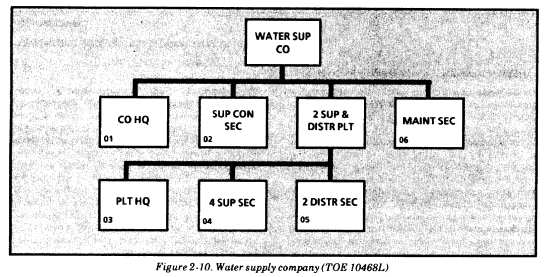 Water supply companies (see Figure 2-10) operate bulk storage and distribution facilities for GS water operations. Each company has two 800,000-gallon PWS/DS with two organic TWDS each. Each TWDS comes with 10 miles of 6-inch hose line, six 600-GPM water pumps, two 20,000-gallon collapsible tanks, and two hypochlorinators. A company can be augmented with up to six TWDS teams, giving it 80 miles of hose line. The 800,000-gallon PWS/DS consists of sixteen 50,000-gaIlon collapsible tanks. The PWS/DSs and TWDSs can be deployed in any configuration, depending on the tactical situation and the commander's desires. The largest storage and distribution system the water supply company operates is the 1.6 million-gallon base terminal (thirty-two 50,000-gallon collapsible tanks).