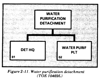 Water purification detachments. These detachments (see Figure 2-11) operate the 3,000-GPH ROWPU. They operate on any large water source and are near base terminals. However, they may be located in the division area, depending on the tactical situation. Each water purification detachment has ten 3,000-GPH ROWPUs and 100 3,000-gallon onion tanks. With this equipment, the detachment can establish five water purification points. It can produce up to 600,000 GPD of potable water from fresh water and 400,000 GPD from salt water. It can store 300,000 gallons of potable water. It cannot deliver treated water to other storage facilities in the corps area or COMMZ, but depends on medium truck companies or a TWDS to do this.