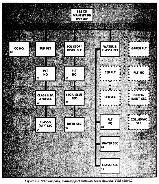 Heavy divisions. Figure 2-2 depicts the organization for water support in the S&S company of heavy divisions (TOE 42007L). The water section in armored, infantry, and mechanized divisions has ten 600-GPH ROWPUs, thirty 3,000-gallon onion tanks (90,000 gallons), two 3,000-gallon SMFTs (6,000 gallons), and three FAWPSSs (9,000 gallons). With this equipment, the section can establish one water purification site in each BSA and two sites in the DSA. Each water point will have two 600-GPH ROWPUs. They can produce 24,000 GPD of potable water from fresh water and 16,000 GPD from salt water. This gives the division a total production of 120,000 GPD from fresh water or 80,000 GPD from salt water. Each water point can store 6,000 gallons of potable water in two of the onion tanks and use the third for backwashing and waste removal operations. This gives the division a total storage of 60,000 gallons of potable water. As in the nondivisional QM water supply units, the FAWPSS is used for resupply to isolated units. The SMFTs are used to establish dry water point distribution sites in BSAs and DSAs that do not have a water source.