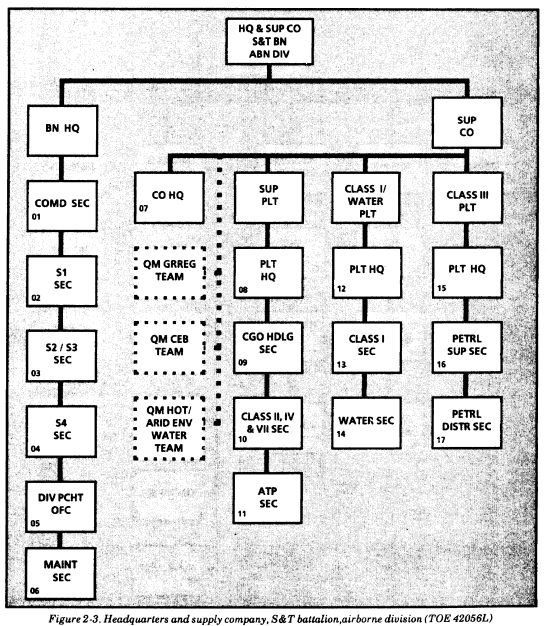 Airborne divisions. Figure 2-3 depicts the organization for water support in the headquarters and supply company (S&T battalion) of airborne divisions (TOE 42056L). The water section in airborne divisions has eight 600-GPH ROWPUs (96,000/64,000 GPD), twenty-four 3,000-gallon onion tanks, two 3,000-gallon SMFTs (6,000 gallons), and three FAWPSSs (9,000 gallons). With this equipment, the water section can establish one water purification site in each BSA and one in the DSA. It can also establish several dry water points using the SMFTs and resupply isolated units with the assigned FAWPSSs. The division's daily total is 96,000 GPD of potable water from fresh water and 64,000 GPD from salt water. The division can store 48,000 gallons of potable water. (Eight of the 24 onion tanks are used for brine and backwashing operations.)