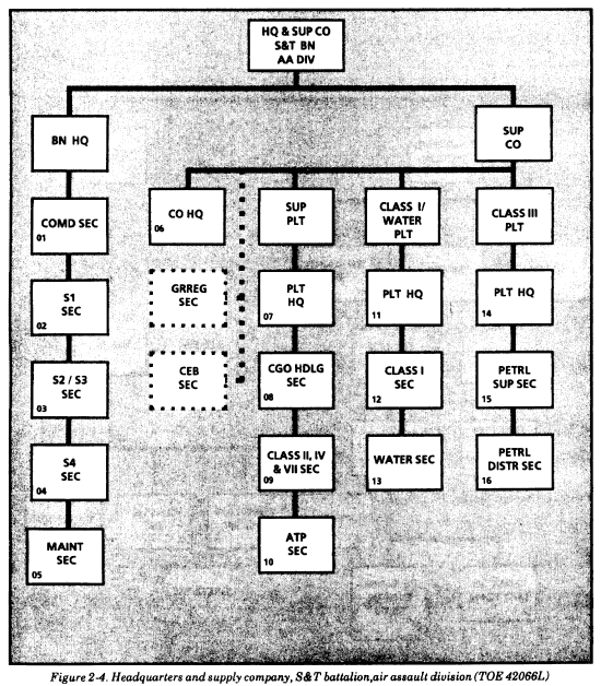 Air assault divisions. Figure 2-4 depicts the organization for water support in the headquarters and supply company (S&T battalion) of air assault divisions (TOE 42066L). The water section of the air assault division has eight 600-GPH ROWPUs (96,000/64,000 GPD), twenty-four 3,000-gallon onion tanks, and three FAWPSSs (9,000 gallons). With this equipment, the division can conduct the same operations as the airborne division with the exception of those involving the SMFT. The SMFT has been dropped from the division's TOE due to airlift requirements and reduced mobility. Therefore, the water section cannot deliver large quantities of water to consumers. Additionally, only the FAWPSS can be used as dry water point distribution centers. This gives the division 96,000 GPD of potable water from fresh water and 64,000 GPD from salt water. It can store 48,000 gallons of potable water. (Eight of the 24 onion tanks are used for brine and backwashing operations.)