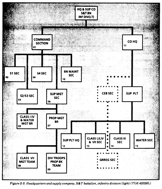 Infantry division (light). Figure 2-5 depicts the organization for water support in the headquarters and supply company (S&T battalion) of light infantry divisions (TOE 42026L). The water section of a light infantry division has six 600-GPH ROWPUs (72,000/48,000 GPD), eighteen 3,000-gallon onion tanks, three 3,000-gallon SMFTs (9,000 gallons), and five FAWPSSs (15,000 gallons). With this equipment, it can establish three water purification points in the BSA. Rear area units must go to a BSA water point or to a corps operated water point for water support. Because of the limited vehicular mobility of the LID, water distribution will be by unit distribution to light infantry battalions. Water will be moved forward from the BSA to these battalions by using five FAWPSSs and the organic ROWPU's 5-ton prime mover. Water will be transferred from the FAWPSS to 160-gallon pillow tanks located in the equipment operated by the battalion supply trains. Units must pick up supplies at battalion distribution points. The water section can produce 72,000 GPD of potable water from fresh water and 48,000 GPD from salt water. It can store 36,000 gallons of potable water. (Six of the 18 onion tanks are used for brine and backwashing operations.) While it does have SMFTs, it has no trucks to move them. It must request transportation assistance.
